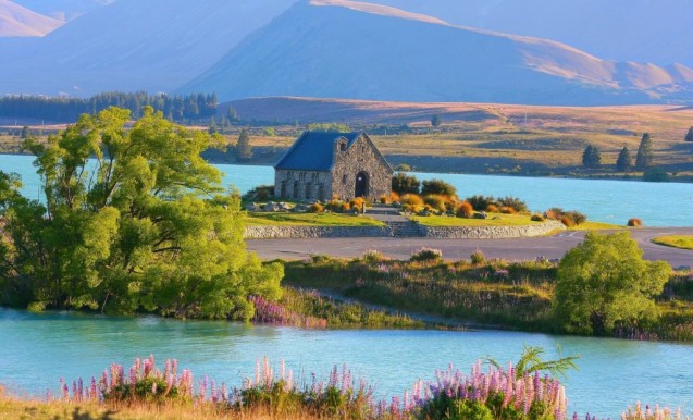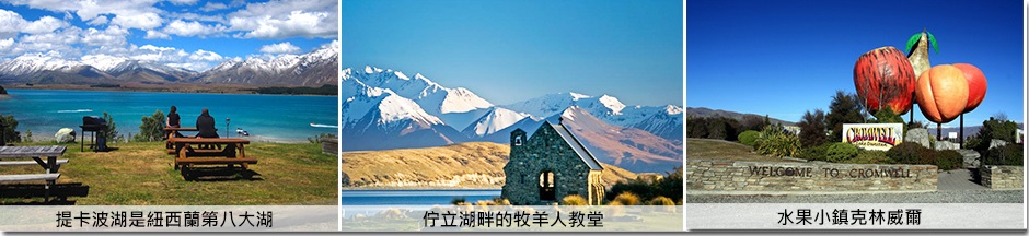 經蒂阿瑙(Te Anau)的一夜停留後 ,隨後抵達克林威爾水果鎮,這裡是南島的果鄉,12-1月產有藍莓與櫻桃,而後產有杏桃,果實大而飽滿,喜歡吃水果的貴賓請別錯過。 提卡波湖(Lake Tekapo)位於庫克山前,湖水來自庫克山溶化的雪水,湖中有著來自冰川的懸浮微粒,在太陽的照射下,湖面反映著獨特的藍色,隨著時間更映漾出不同的水色,美不勝收。提卡波湖是紐西蘭第八大湖,湖畔有座牧羊人教堂(Church of the good Shepherd),是由石塊堆砌的小教堂,名字來自於聖經,靜靜地座落一隅,與庫克山遙望,簡單質樸,充滿詩意,記得和教堂邊的牧羊犬雕像拍張照片。來到此地,洗滌一下心靈,感受這天地間的純淨之美。今晚入住以紐西蘭代表性美景聞名的提卡波湖區( Lake Tekapo)。 |