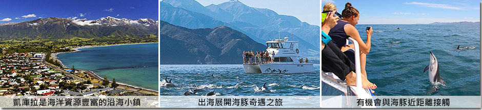 若影片無法觀看請點此 | 飛美家旅遊特別安排 凱庫拉海豚奇遇 凱庫拉(Kaikoura)距離基督城約兩個多小時的車程,因為位於冷暖洋流的交會處,同時還有深達一公里的大海溝,有著豐富的蜉蝣生物,是許多海洋生物喜歡棲息的地方。所以可以見到各種海鳥、海豹、海豚和鯨魚。各種海上活動盛行。 |