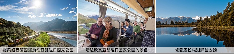 阿爾卑斯高山景觀火車TransAlpine號 TranzAlpine號從基督城出發,沿著南阿爾卑斯山爬升,經過肥沃的Canterbury平原、Waimakariri冰河、Sarah湖,及壯麗峽谷到達亞瑟隘口國家公園。 | 若影片無法觀看請點此 |