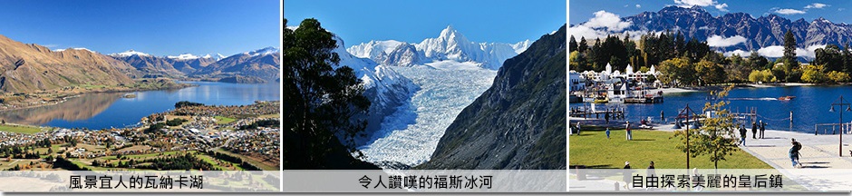 今日早晨我們將前往冰河遺跡,飛美家旅遊特別安排 直升機冰河之旅,全市場首先推出把直升機的自費活動,包含納入在我們的團體行程中。讓您親身用雙腳體驗踏上原始的冰河大地 與吸入冷冽的極地空氣所帶來之難忘感動。這是一趟最佳走訪福斯冰河的旅程,在一般人無法到達的高空上,覽盡冰河瀑布的美麗景觀,窺見深邃的冰河裂縫,猶如探險般的旅程。從空中享受完獨佔的快感後,小心降落再冰河少數的平地之上,而後經亞斯比靈山國家公園後直達瓦納卡。餐後,可以到湖畔散步,瓦納卡湖與白雪靄靄的山相輝映,儼如一幅美麗的圖畫。紐國首屈一指的度假勝地瓦納卡,因地處阿斯匹林山的登山口又瀕臨瓦納卡湖,滑雪、遊湖、釣鱒魚都是這裡熱門的休閒活動。迷惑世界 ( the puzzling world)是這裡最受歡迎的主題樂園,最知名的大型迷宮(The great maze )全長1.5公里,雙層的立體構造與錯綜複雜的路線,平均要2小時遊客才能順利走出,傾斜53度的瓦納卡傾斜塔與3D立體影像廳都挑戰您的視覺極限,等你來體驗。今晚夜宿於皇后鎮。 ***飛美家旅遊市場首推:早鳥報名贈送直升機冰河之旅,讓您親身用雙腳體驗踏上原始的冰河大地 與吸入冷冽的極地空氣所帶來之難忘感動*** 備註: 1.報名時請與本公司確認是否獲贈參加直升機冰河之旅,若不欲參加者請及時告知並由團費折扣。 2.若因天候不佳、地震等不可抗力因素,導致無法飛行,則將以台幣做退費給已確認參加直升機冰河飛行之旅的貴賓。 |