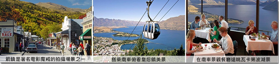 南島渡假勝地-皇后鎮2晚 Queenstown 皇后鎮是南島的度假勝地,南阿爾卑斯山脈一路延伸,與瓦卡蒂波湖相會在這裡。不僅電影魔戒在此取景,這邊也是戶外運動愛好者的天堂,隨時可見飛行傘、熱氣球在空中盤旋,據說高空彈跳的發祥地也在皇后鎮。 |