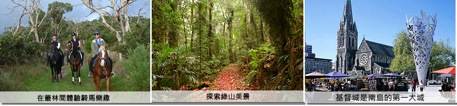 在小教堂的祝福下,遊客們離開提卡波湖,前往紐西蘭第三大城基督城(Christchurch)。我們首先來到坎特伯里區的森林馬場,這是一項難忘的森林體驗,飛美家旅遊特別安排◇森林騎馬,大約1小時左右的馬背騎馬,上馬前仔細聆聽專家所介紹活動所需的注意事項。在大自然的擁抱下溫順的馬兒帶您穿梭在森林間漫步,途中飽覽此區的秀麗景色,從平原到高山,用不同的高度欣賞這難得一見的風景。為安全考量,旁邊皆有專業訓馬師跟隨;不從事此活動的旅客,擇改為森林健行活動,且恕不退費,請知悉。 經過12天紐西蘭與澳洲純淨大自然的體驗,懷著滿滿的回憶,來到機場,踏上歸途,回到溫暖的家。 |