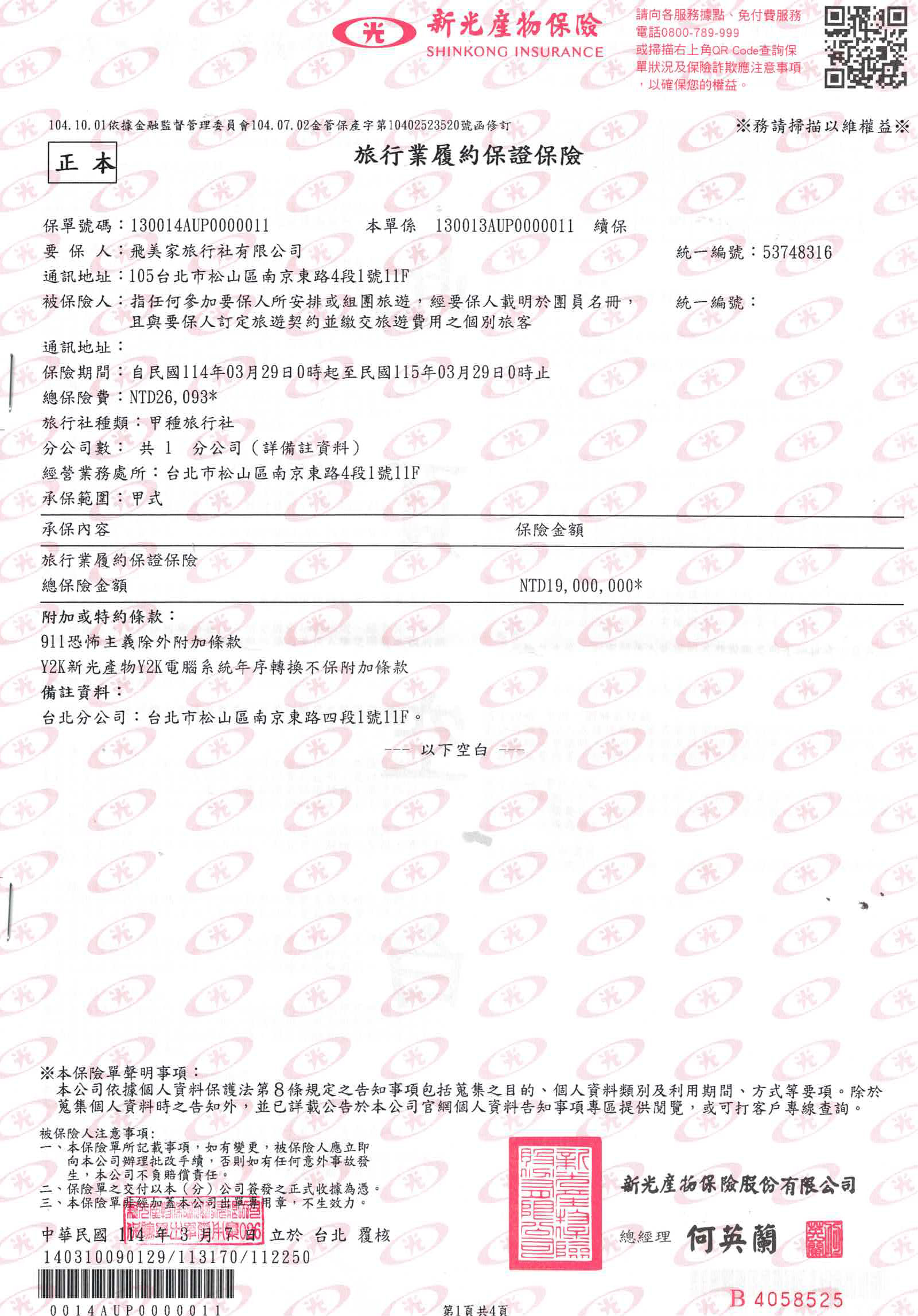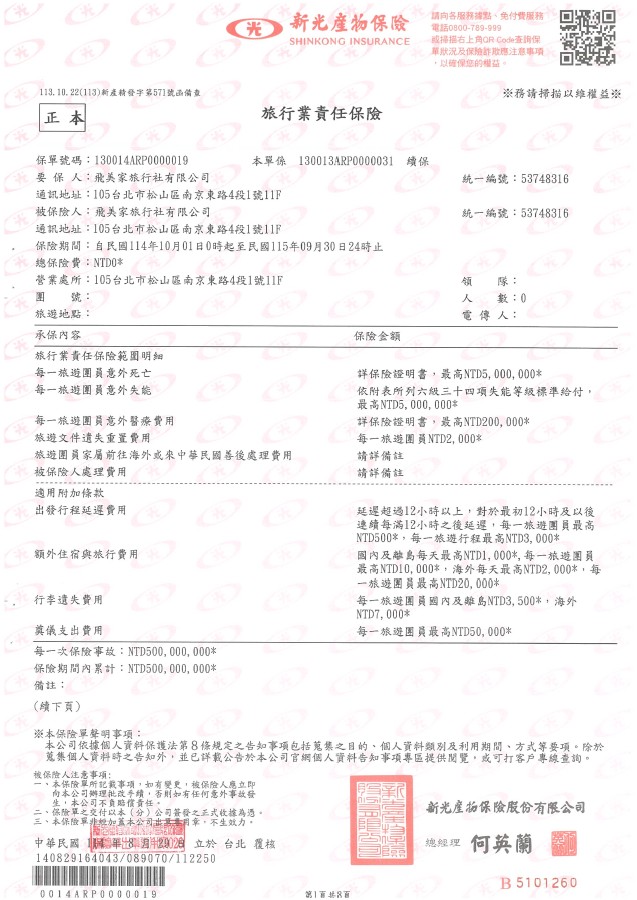 公司簡介 專營歐美長程線團體旅遊、包團、客制團體行程、商務團 美加線:深度黃石|洛磯山脈|加東賞楓|NBA・MLB行程|迪士尼遊輪 歐洲線:瑞士鐵道|德國|奧地利|英國|歐洲山水秘境|阿爾卑斯山水秘境|北歐 紐澳線:紐西蘭|澳洲 長天數特殊路線 精選遊輪 【執照與證書】 【旅行業履約保證保險&責任保險】