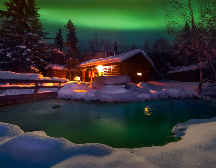 飛美家特別安排連住兩晚,擁有一百多年歷史,是阿拉斯加唯一全年皆開放的旅館,也是著名的追逐極光地點。珍娜度假村以天然溫泉而聞名,分為室內溫泉池以及戶外天然溫泉岩湖,在此可以體驗到在戶外零下二、三十度泡湯的特殊樂趣,幸運的話,還可能在享受溫泉的同時欣賞極光在夜空舞動的迷幻場景。