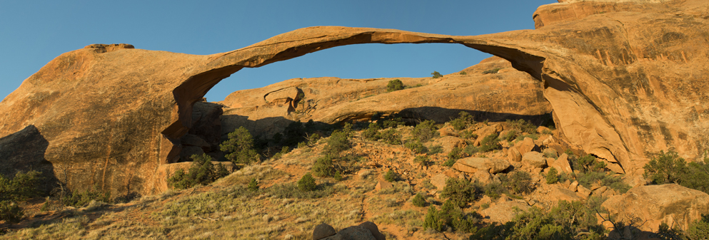 早上帶您再次進入拱門國家公園,在 Devils Garden(魔鬼花園)高大的鰭狀岩之間徒步,相對平坦的砂石步道(環狀約2.6公里),可抵達如緞帶般壯麗的石拱,觀賞跨度超過100公尺,北美最長的Landscape Arch景觀拱門。今天需要一點腳力,請務必做好防曬措施,並準備足夠的水,隨時補充水分。