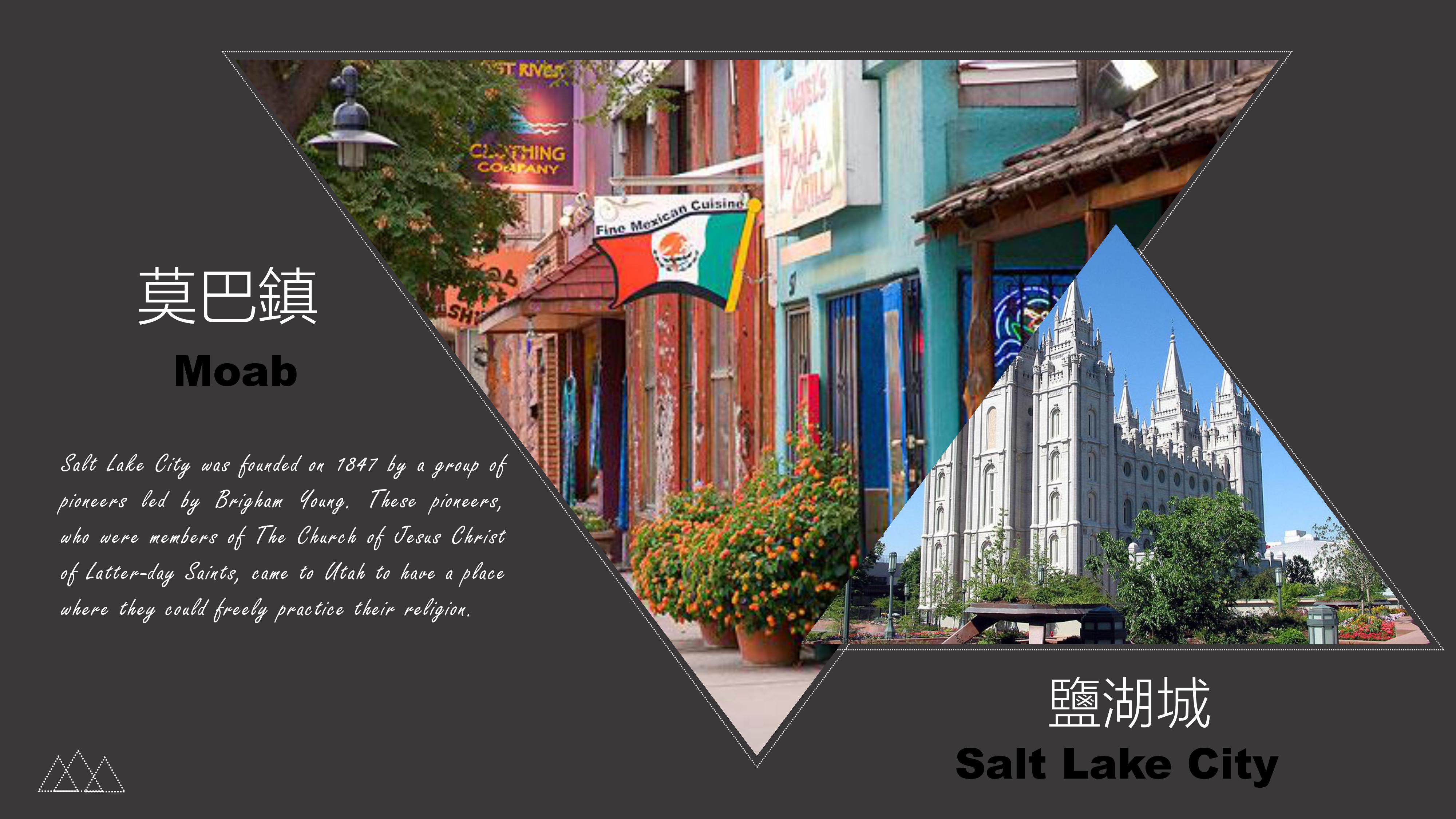 鄰近拱門與峽谷地兩大國家公園的莫巴鎮,是一座美國西南方典型的觀光小城,一條主要的大街上林立各種紀念品店、餐廳、酒吧與飯店,每年春天至秋日的旅遊旺季是這座小鎮最為熱鬧的時候,無數的遊客途經此地,為小鎮帶來旺盛的活力。 | 鹽湖城是美國猶他州的首府與最大城,以緊靠大鹽湖而得名。猶他州原來是一片荒漠,十九世紀時,摩門教徒在此建立家園,此後該教會的總會變設立在此。採礦業和第一條橫貫鐵路的興建帶來了鹽湖城的經濟繁榮,獲得了「西部十字路口」的綽號,並且舉辦了2002年冬季奧運會。 |